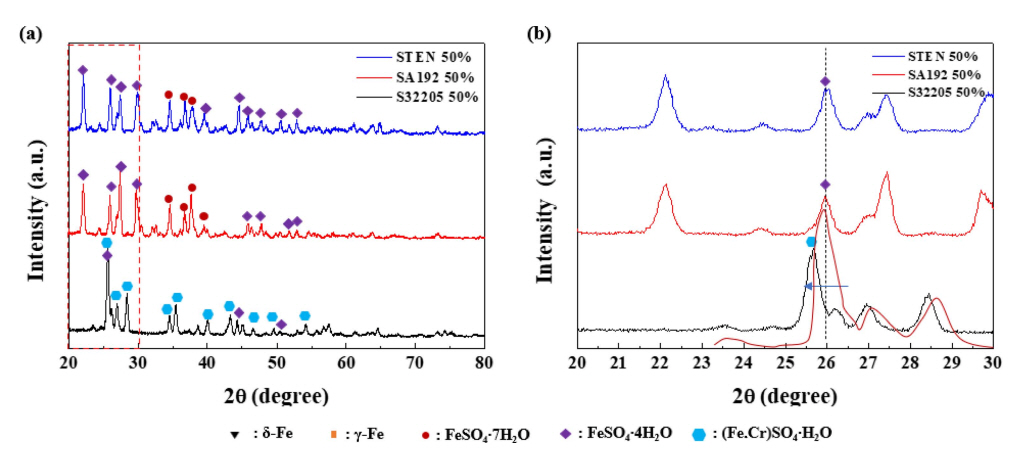 그림 10는 고농도 황산 수용액 조건 내 24 시간 동안 침지한 시편을 대상으로 측정한 XRD 결과를 나타낸다. 저농도 조건의 결과 (그림 8)와 마찬가지로, 탄소강 계열 시편 표면에 형성된 부식생성물은 주로 FeSO4·4H2O 및 FeSO4·7H2O로 확인되었다. 반면, 기지조직의 피크 만이 검출되었던 저농도 조건의 S32205와 달리 고농도 조건의 경우, 탄소강 계열 시편과 유사하게 Fe