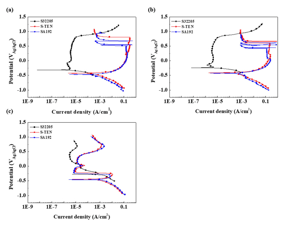 SA192 및 S-TEN 시편들에서는 활성 용해 거동이 나타나며 시편 간 유의한 차이가 나타나지 않은 반면, S32205의 경우 양극분극 시 안정적인