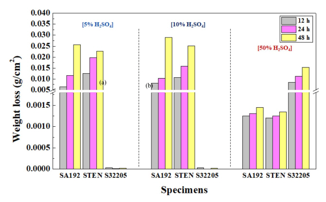 그림 5는 침지시간에 따른 시편 별 무게 감량 측정 결과를 나타낸다. 저농도 황산 수용액 조건의 경우, S32205는 표면에 안정적인 부동태 피막 형성에