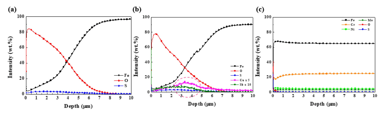 결과 (그림 9), Cu와 Sb는 각각 소지철/생성물 계면과 계면인접부 생성물 층에 농화되며 Fe의 용출 억제에 기여하는 것으로 사료된다. 다만, 생성물 형성과