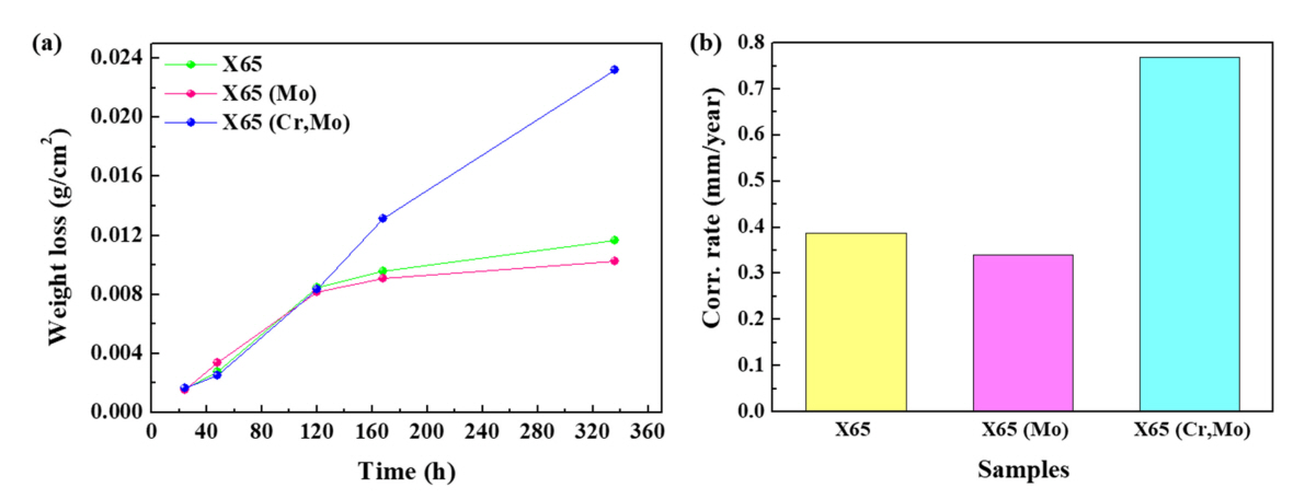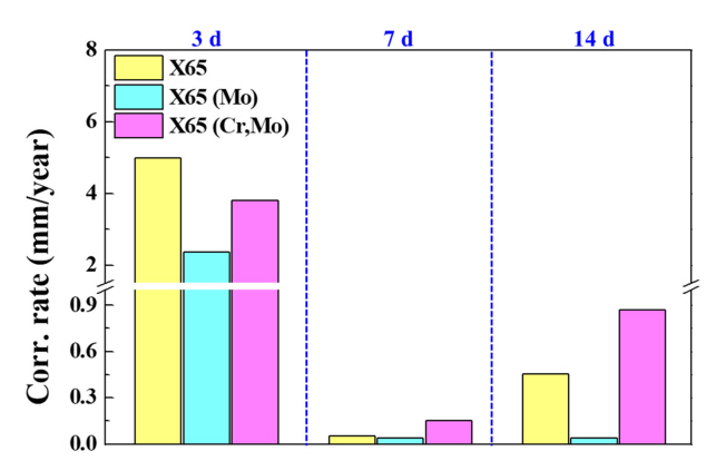 거동을 보였다. 침지 후기 (14일) 무게감량 데이터를 토대로 부식 속도를 도출한 결과 (그림 7(b)), X65 (Mo) < X65 < X65 (Cr,Mo) 순서로 부식속도가 높게 평가되어, 전기화학적 부식거동 분석 결과와 상응하는 것으로 나타났다.