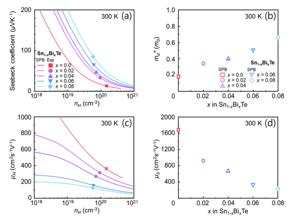 설명하는 데 사용된다. md*를 피팅하여 계산한 nH변화에 따른 S는 그림 1(a) 내 실선(solid line)으로 표시하였다. 그림 1(a) 에서 피팅한 md*는 그림 1(b)에 도형(empty symbol)로 표시하였다. 그림 1(b)에 따르면 Bi 도핑량이 증가할수록(x= 0 - 0.08) md*가 증가하는 경향을 관찰할 수 있다. 가장 높은 md*(~0.66 m0)을 가지는 Sn0.92Bi0.08Te의 경우 모상 SnTe의 md*(~0.18 m0) 대비 약 3.6배 높은 결과를 보였다(m0 는 전자의 정지 질량(electron rest mass)임).