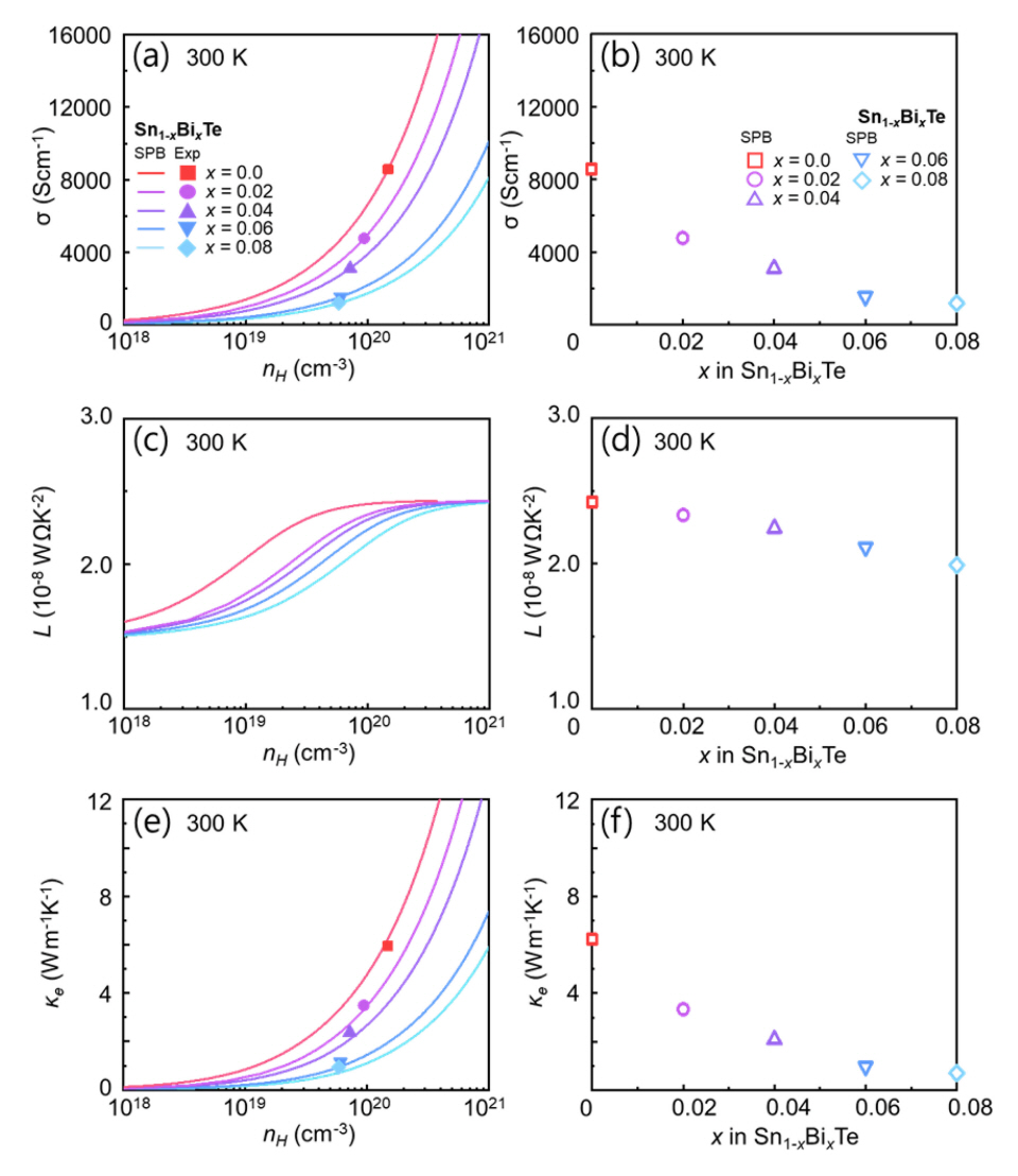 (a) Experimental (symbols from Ref. 26) and calculated (lines) σ as a function of nH for Sn1-xBixTe (x = 0 - 0.08) at 300 K. (b) The theoretical σ calculated as a function of Bi doping content (x). (c) Calculated (lines) L as a function of nH for different x. (d) The L calculated as a function of x. (e) Experimental (symbols from Ref. 26) and calculated (lines) κe as a function of nH for Sn1-xBixTe (x = 0 - 0.08) at 300 K. (f) Calculated κe as a function of x.