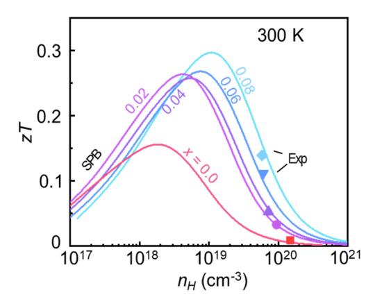 그림 4는 그림 3(c)에서 계산한 B-factor를 기반으로 SPB 모델로 계산한 nH에 따른 이론 zT 변화(실전)와 Zhou et al.이 보고한 zT 측정값(filled 모양)을 보여준다. 그림 3(c)에 나타낸 x에 따른 B-factor 값과 그림 4에 나타낸 이론 zT 최대값과 비례하는 것을 확인할 수 있다. 다시 말해, B-factor가 가장 낮은 x= 0.0 샘플(Bfactor = 0.05)의 경우, 이론 zT 최대값 또한 약 0.15로 x 중 가장 낮았다. 하지만, 그림 3(c)에서 B-factor가 가장 높았던 x= 0.08 샘플(B-factor = 0.075)의 경우, 이론 zT 최대값 또한 약 0.31로 여러 x 중 가장 높다. 그림 4에 따르면, SnTe에 Bi를 도핑하면 순수 SnTe 대비 향상된 zT를 얻을 수 있다 (300K). x= 0.02, 0.04인 경우 높은 μw의 영향으로 향상된 zT가 나타났으며, x= 0.06, 0.08의 경우 크게 감소된 κl의 영향으로 향상된 zT가 나타났다 (그림 3). 이론적으로 300 K에서 얻을 수 있는 zT의 최댓값은 0.311(x= 0.08)로 계산되었으며, x= 0.02, 0.04, 0.06 역시 각각 0.275, 0.268, 0.280으로 x= 0.0 (zT = 0.160)에 비해 높은 이론 최대 zT값을 보였다. Zhou et al.의 실험 zT값(filled 모양)과 SPB 모델 결과를 비교해보면 x= 0.08 샘플의 nH를 9.06 × 1018 cm-3까지 감소시켰을 때, 기존 실험 zT(= 0.139) 대비 약 2.2배 향상된 zT = 0.311를 달성할 것으로 예측되었다.
