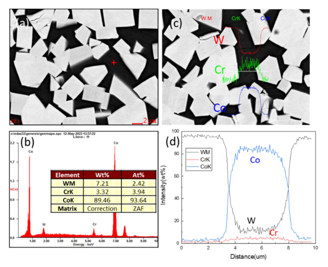WC/Co ๊ณ๋ฉด์์ ์๋ก ํ์ฐํ๊ณ ์๋ ๊ฒฝํฅ์ผ๋ก ๋ํ๋๋ค. Cr์ Co์ ๋ํ ์ฉํด๋๊ฐ ํฌ๊ธฐ ๋๋ฌธ์ ์์จ์์ ๊ณ ์ฉ ์ํ๋ก ์กด์ฌํ๋, W์ ์์จ์์