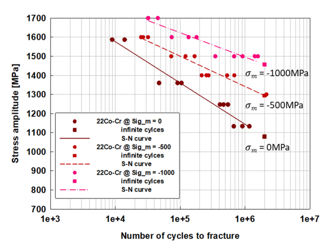 ๊ทธ๋ฆผ 8์ 22Co-Cr ์ด๊ฒฝ ํฉ๊ธ์ ๋ํ ํ๊ท ์๋ ฅ์ด -500 MPa๊ณผ -1000 MPa์์ ์ํํ ์ผ์ถ ํผ๋ก ์ํํ ๊ฒฐ๊ณผ์ ํ๊ท ์๋ ฅ 0์ธ 22Co-Cr