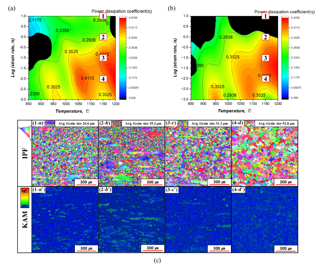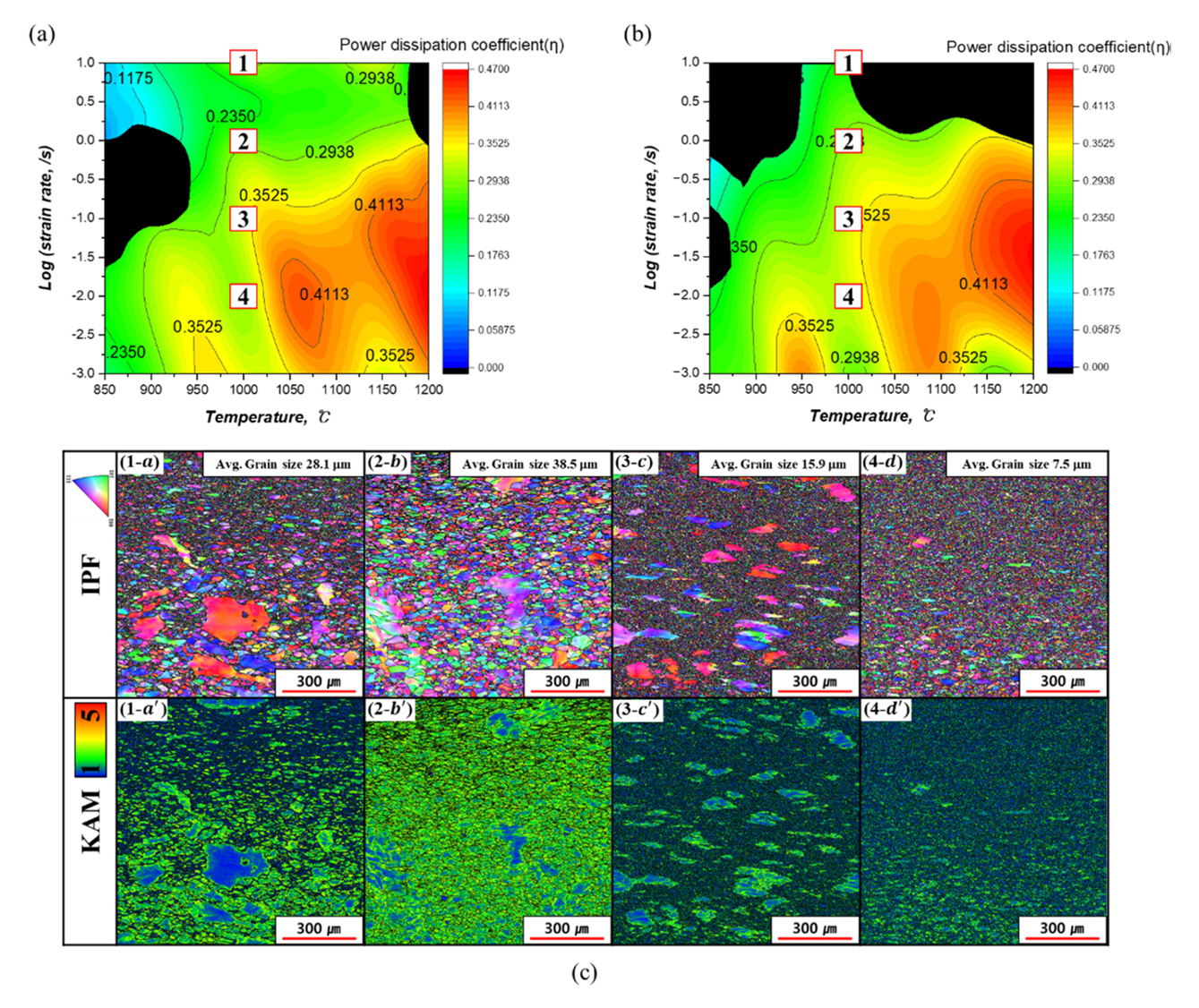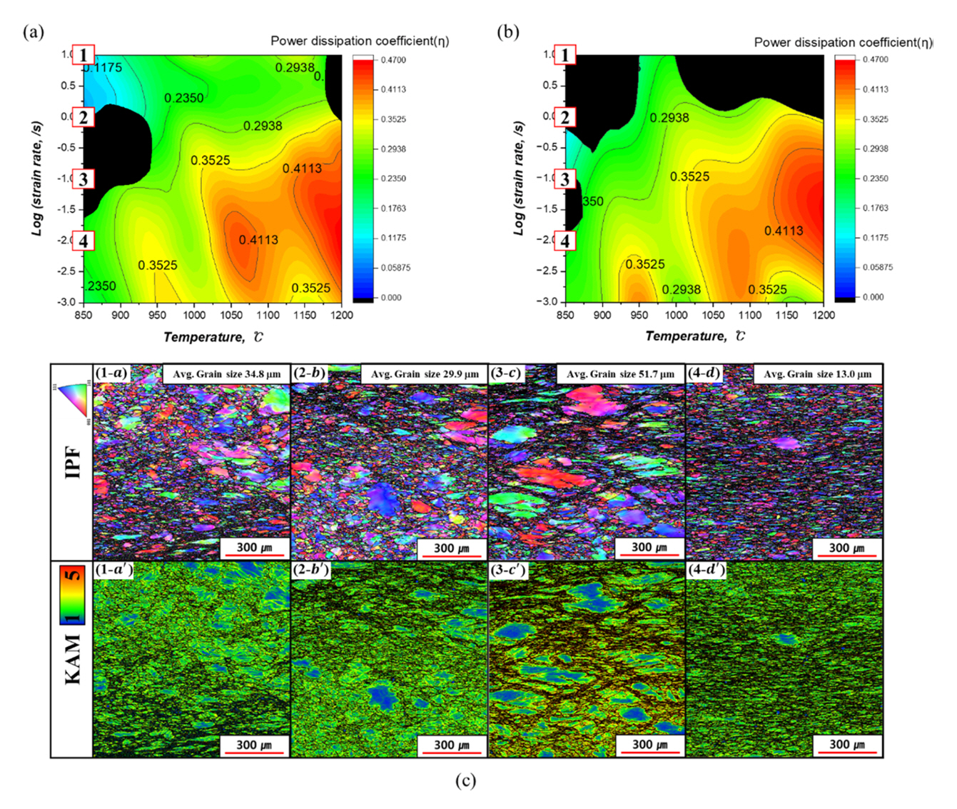 criterion)을 포함한 공정 지도를 제작하였다. 고온에서의 소성변형 거동 및 열간 성형에 따른 미세조직의 변화를 고려하여 공정 변수에 따른 미세구조적