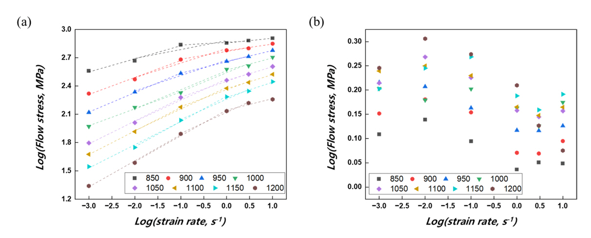 구형화 등 미세구조적 변화에 영향을 미친다. 이러한 미세구조적 변화는 변형속도 민감 지수에 의해 온도 및 변형속도의 함수로 얻어질 수 있으며[21], 다음과 같이 표현할 수 있다.