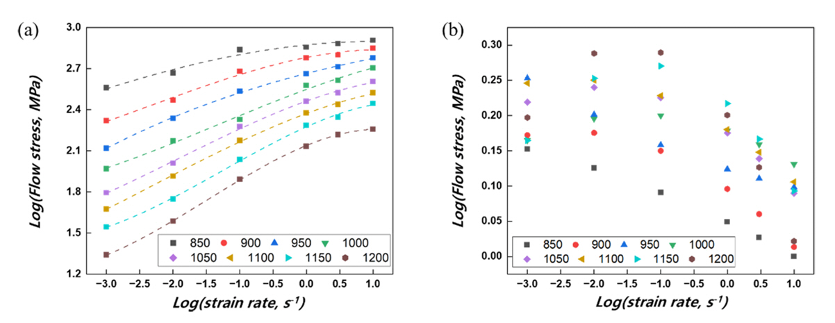 softening)가 평형을 이룰 때 나타나는 것으로 알려져 있다[14,15]. 열간 변형 중 일정한 온도에서 변형속도가 증가할수록, 일정한 변형속도에서 온도가 감소할수록 유동응력은 증가한다[16]. 그림 3에서 확인할 수 있듯이 열간 변형 중에서 높은 온도와 낮은 변형속도에서 연화 현상이 두드러지며, 이는 결정립계의 이동성과 동적 재결정의 속도가 고온이나