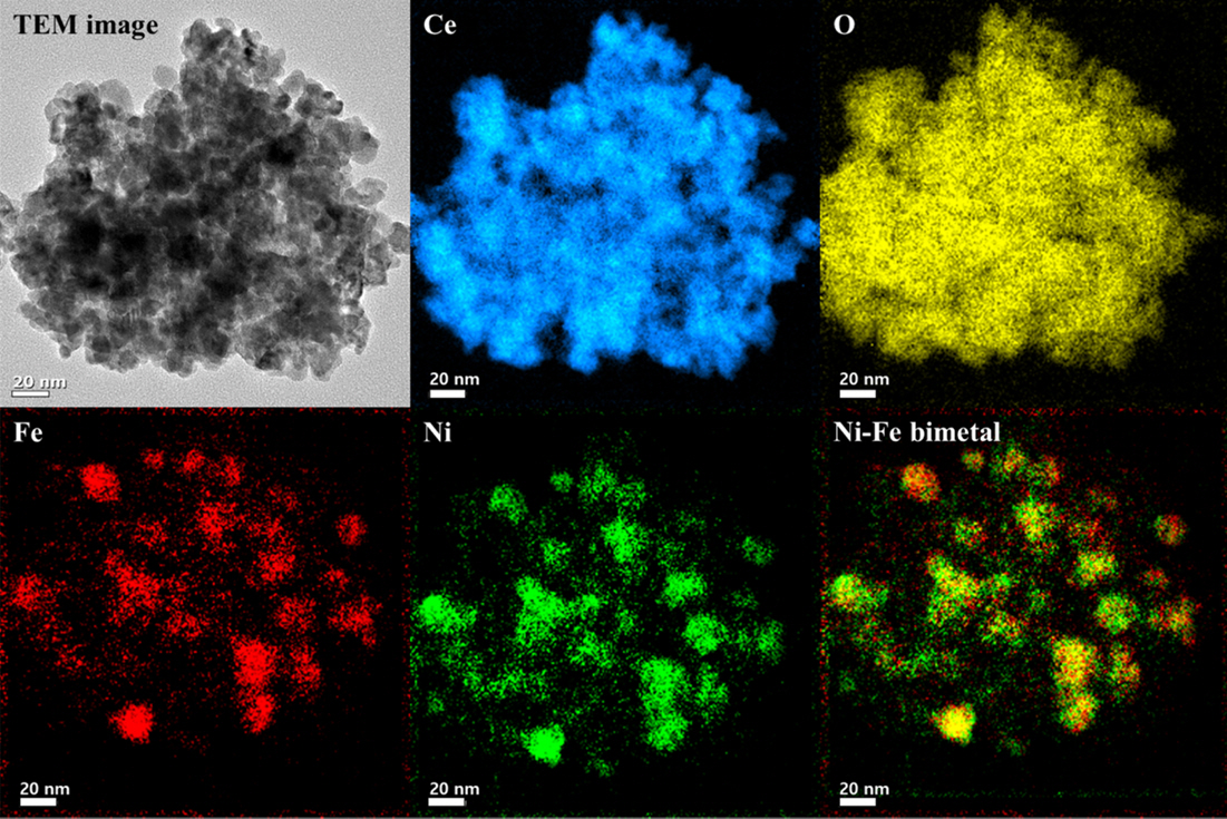 TEM and EDS mapping images obtained on NiFe/CeO2 catalyst