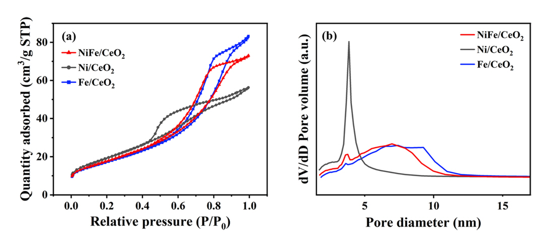 ์ด๋งค๋ ๊ฐ๊ฐ Ni/CeO2, Fe/CeO2๋ก ํ๊ธฐํ์์ผ๋ฉฐ, bimetallic ์ด๋งค๋ NiFe/CeO2๋ก ํ๊ธฐํ์๋ค.