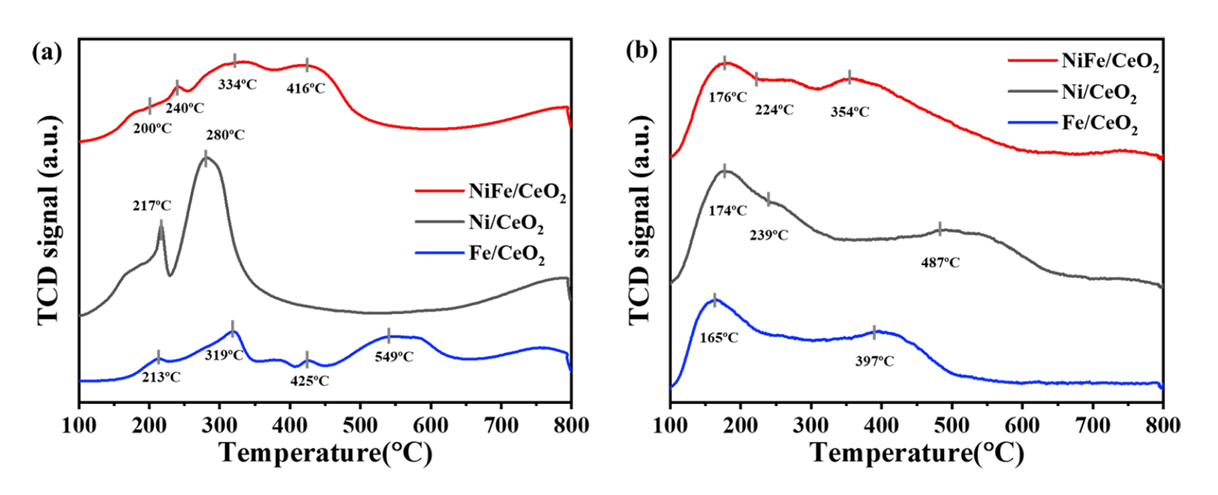 (a) H2-TPR profiles and (b) CO-TPR profiles for Fe/CeO2 (blue line), Ni/CeO2 (gray line) and NiFe/CeO2 (red line).