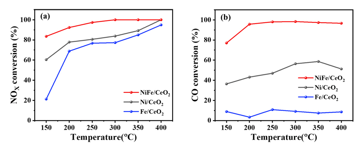 (a) NOX conversion, (b) CO conversion over Fe/CeO2, Ni/CeO2, NiFe/CeO2 catalysts. Feed composition: 500 ppm NO, 5000 ppm CO, 0.4 vol% O2, and balanced with N2 (GHSV: 22,800h-1).