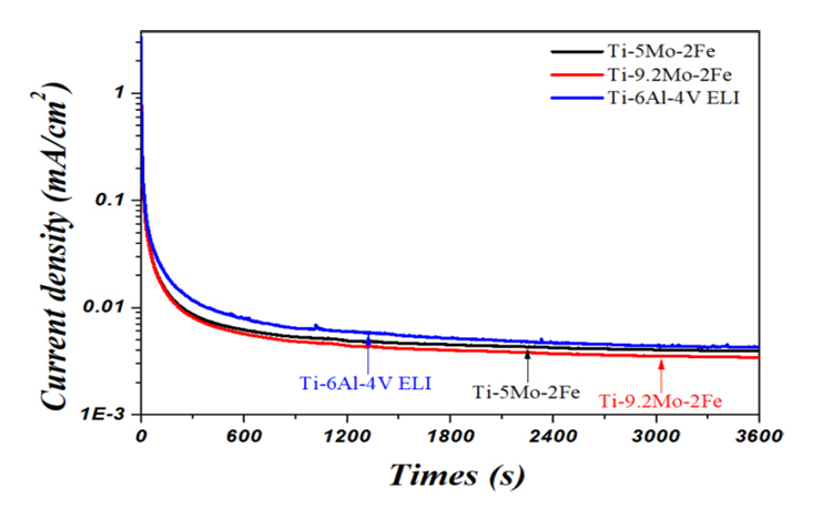 Potentiostatic polarization curves of Ti-5Mo-2Fe, Ti-9.2Mo-2Fe and Ti-6Al-4V ELI alloys