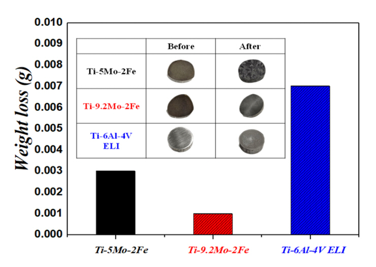 Weight loss data of Ti-5Mo-2Fe, Ti-9.2Mo-2Fe and Ti-6Al-4V ELI alloys