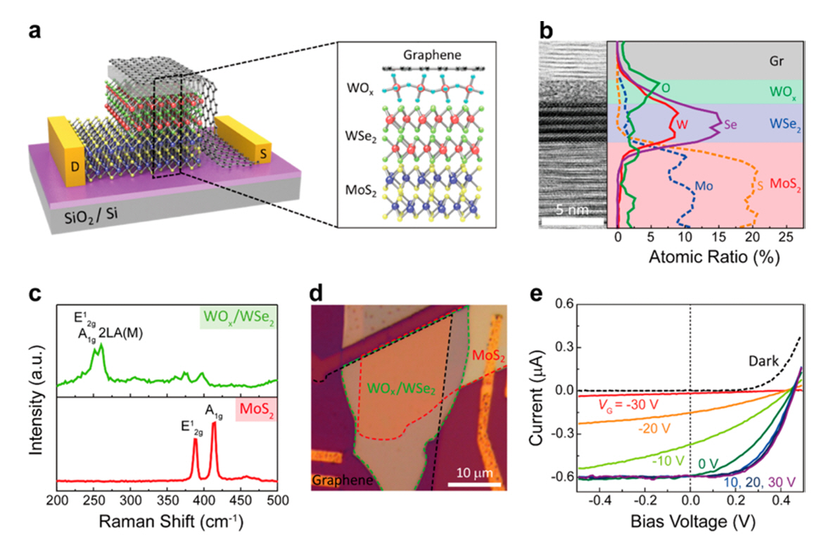 Interface contact engineering based on WSe2-MoS2 p-n photovoltaic heterojunction [29]. (a) Device structure of graphene/WOX/WSe2/MoS2 on SiO2/Si. (b) Cross-section HR-TEM image and EDS line profiles such as tungsten