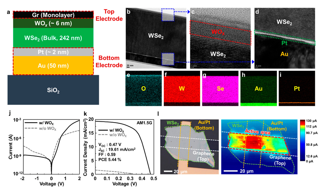 그림 2는 WSe 2 −MoS2 p−n 접합 태양전지의 효율을 향상시키기 위해 원자 두께의 텅스텐 산화막 (Tungsten oxide, WOX) 층은 텅스텐 디셀레나이드 (Tungsten diselenide, WSe2의 층별 산화법으로 홀 추출을 촉진하는 전하 전송 층으로 사용하였으며 이를 바탕으로 WSe2−MoS2 p−n 접합 태양전지의 광응답성을 크게 향상했음을 S. Yang et al. 그룹에서 보고하였다[29]. WSe2 소재 위에 WOX 원자 수준의 두께로 사용하여 변환 효율 0.7%에서 5.0%로 증가했는데 낮은 쇼트키 장벽 (Schottky barrier)과 유리한 인터페이스