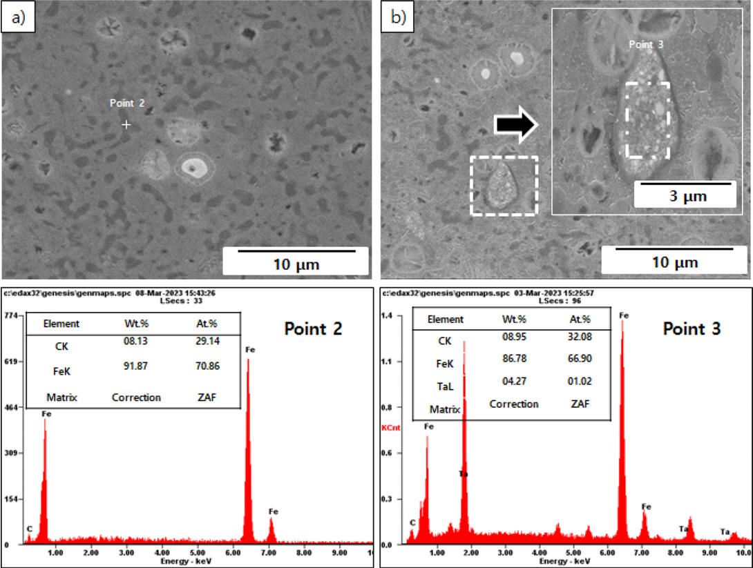 ๊ฒ์ผ๋ก ํ๋จ๋๋ค[23,24]. ๋ํ ๊ทธ๋ฆผ 5์ ์๊ฒฐ์ฒด์ ํ๋ํ ๋ฏธ์ธ์กฐ์ง ๋ถ์ ๊ฒฐ๊ณผ๋ฅผ ๋ํ๋ด์๋ค. Fe-Ta (MAed)์ Fe ๋งคํธ๋ฆญ์ค์ TaC๊ฐ ๋ถ์ฐ๋์ด ์์ผ๋ฉฐ, TaC๊ฐ ์ฝ์ด์ธ white