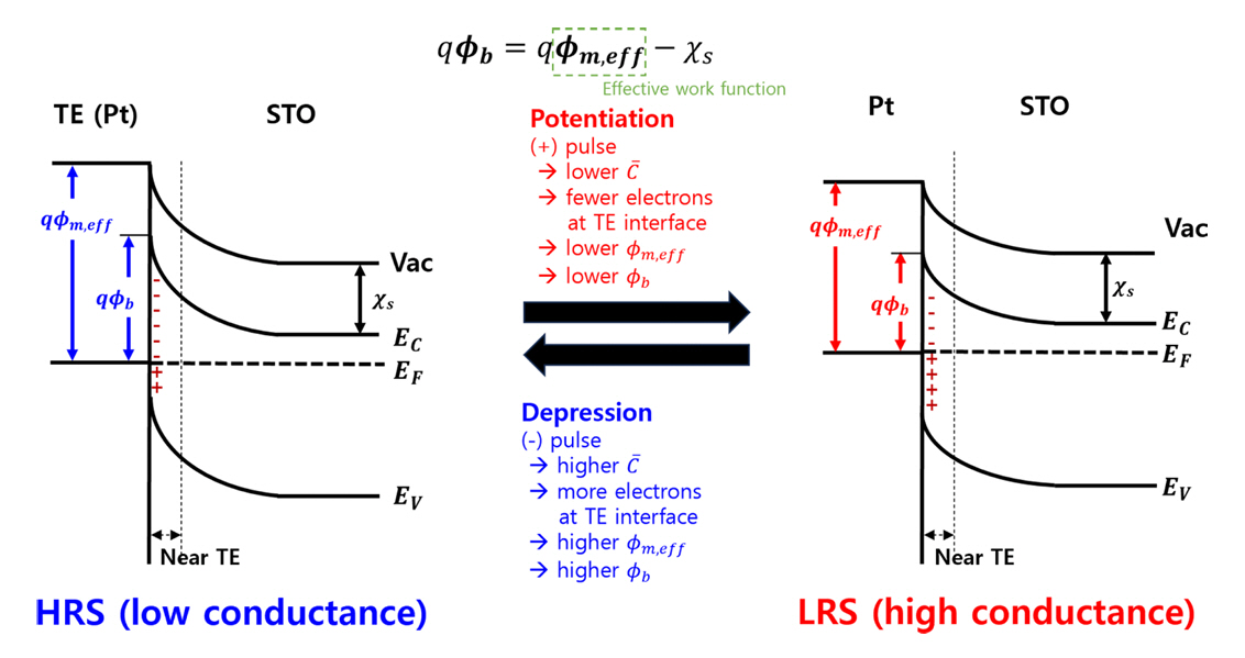 유효 일함수 Φm,eff라 한다. 즉, SBH는 Φb=Φm,eff-χs/q와 같이 Schottky-Mott 법칙의 원래 형태로 나타낼 수 있다. 계면에 트랩된 전자가 줄어들면 Φm,eff가 줄어들게 되어 SBH가 감소하며, 반대로 계면에 트랩된 전자가 늘어나면 Φm,eff가 증가하여 SBH도 증가한다. 상부전극(TE, top electrode)인 Pt에 (+) 전압 펄스(pulse)를 인가하면, (+) 전하를 갖는