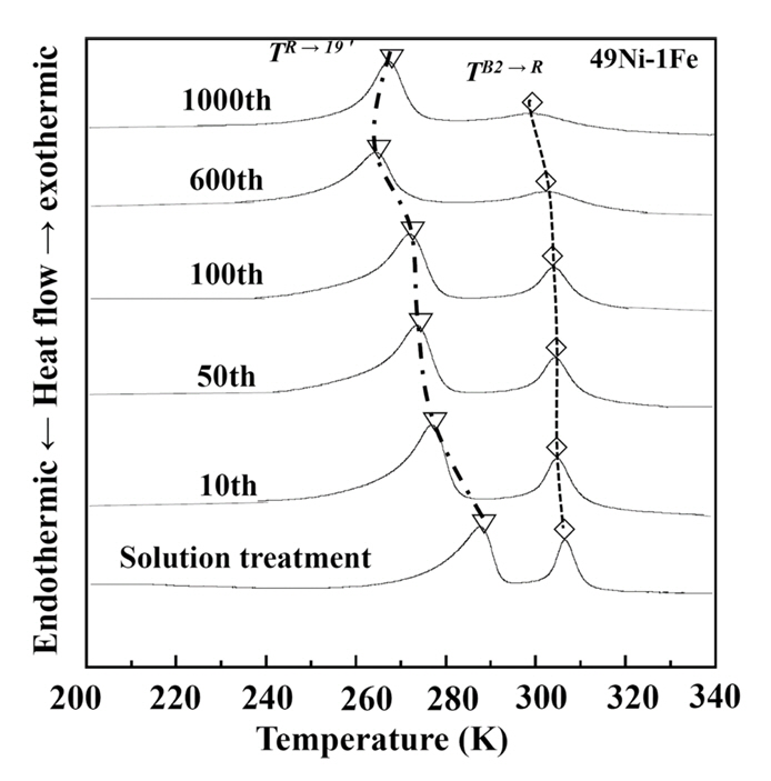 발생하고 가열 시 나타나는 하나의 변태 피크는 B2↔B19′ 변태의 큰 변태 히스테리시스로 인해 B19′↔R 변태 없이 B19′에서 모상(B2)으로
