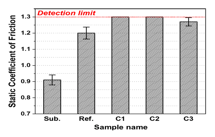 확인할 수 없었으나, 전체적으로 Al-Al2O3 코팅(C1~C3)은 모재 혹은 Al 코팅(Ref.)과 비교하여 월등히 높은 정지 마찰계수를 보였고 이는 미끄러짐 상황에서 물체의 이동을 더욱 효과적으로