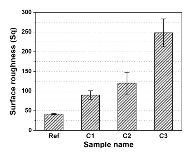 코팅은 모든 샘플 중에서 가장 균일한 표면을 보이고, C3는 가장 불균일하고 거친 표면을 보이며, C1과 C2는 중간 정도의 거칠기를 볼 수 있다.