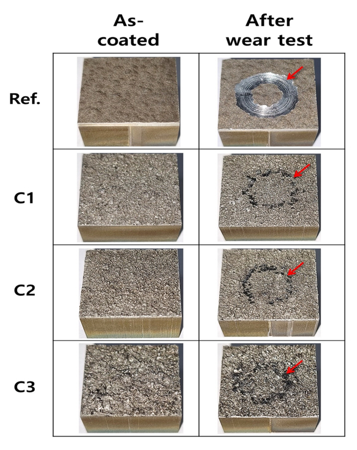 이후부터는 샘플 명칭의 편리성을 위해 순수한 Al 코팅을 Ref.(참고시편)로 나타내고, 3종의 Al-Al2O3 복합소재 코팅을 C1, C2, C3로 각각 나타내었다. 상세한 TWAS 공정조건은 과제 보안 상의 이유로 공개가 불가능하여 공정변수 값의 상대적인