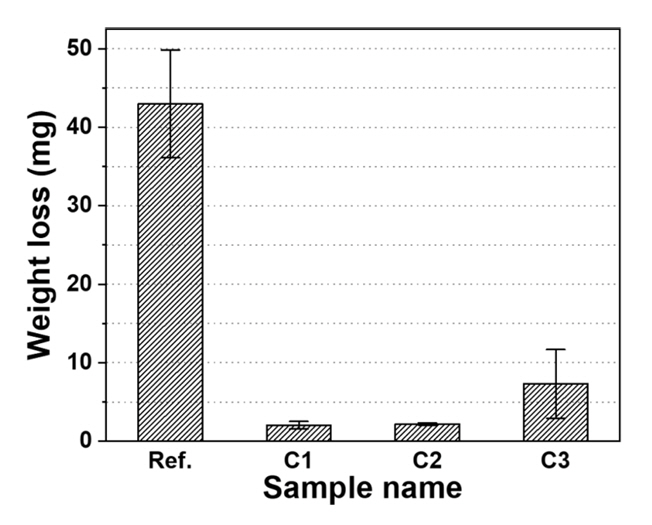 것처럼 본 연구에서 가장 높은 마모량인 42.95 ± 6.86 mg을 나타내었다. C1과 C2는 가장 우수한 내마모 특성을 보였는데, 각각 2.05