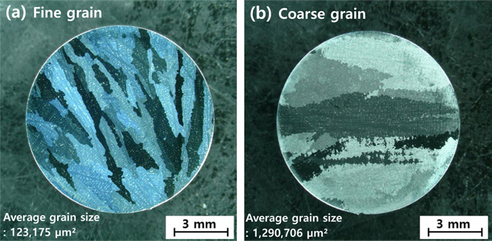 시험편으로 가공되었고, Kalling's no.2 reagent (5 g CuCl2 +100 ml HCl +100 ml CH3CH2OH)로 에칭 후 광학현미경 [Optical microscope (OM)]으로 평균 결정립 크기를 측정하였다. 측정 시에는 불균일한 결정립 형상에