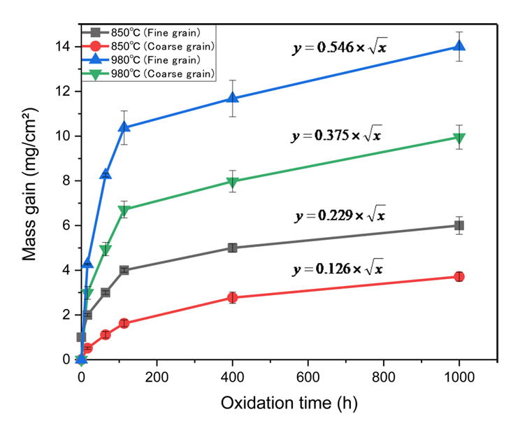 동일 온도에서는 미세 결정립 시험편이 조대 결정립보다 산화 속도가 빨랐으며, 이는 결정립을 제어하는 것이 산화 속도를 결정하는 주요한 요소임을 의미한다.