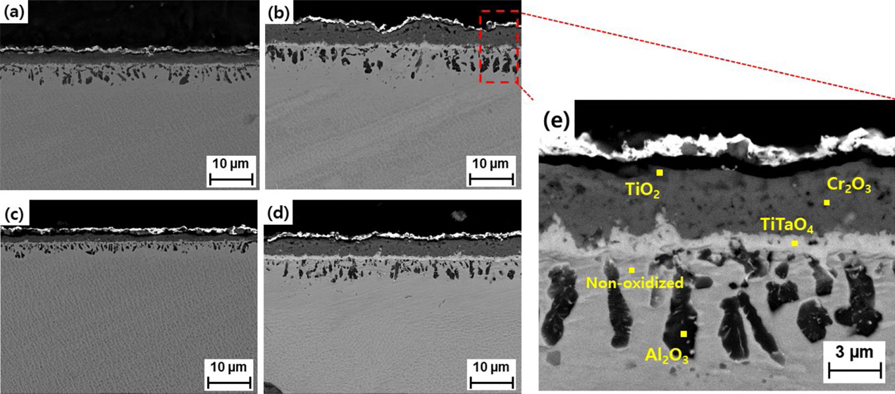외부산화물이 박리된 부분은 TiTaO4 등 내부산화물의 층구조가 사라지고 복합산화물이 형성되면서 Al 산화물이 선 형태로 표면에 가깝게 위치하였다. 이는 고온에서 장시간 산화 시 Cr2O3 대신 Al 산화물이 표면의 산화 보호층으로 작용함을 의미한다. PFZ 영역은 산화물의 박리 여부와 관계없이 산화 시간에 따라 늘어나는 거동을 보였는데,