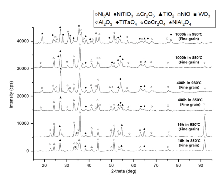 코팅처리를 하지 않은 결정립 크기가 다른 초내열 합금 시편을 사용하였고, 재료의 실제 가동 온도 범위인 850°C와 980°C에서 각 온도별 시간을