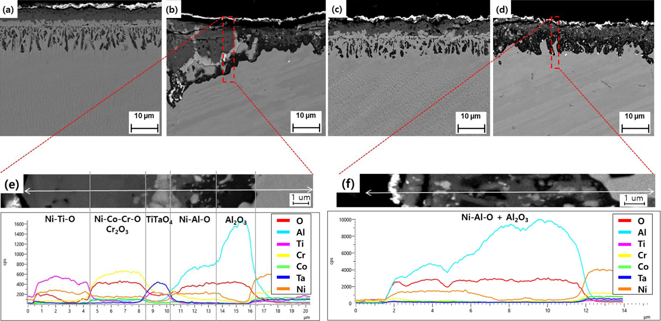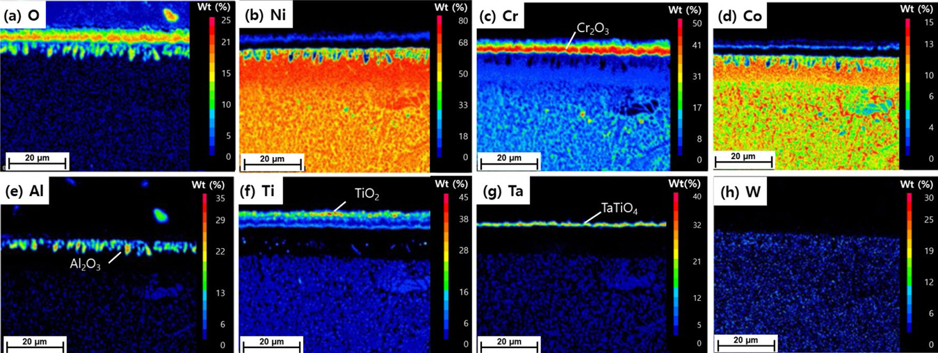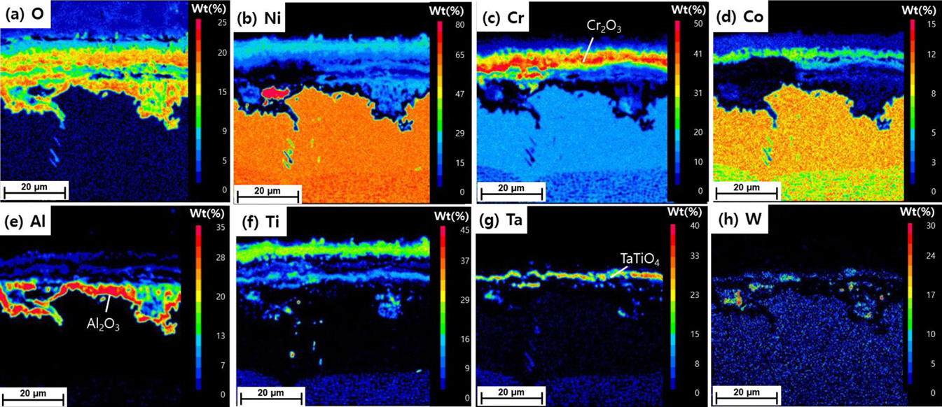 더 자세한 분석을 위해 해당 영역을 EPMA mapping을 수행하였으며, 그 결과를 그림 7에 나타내었다. 980°C, 1000시간 동안 형성된 산화층은 최상단에서부터 ① TiO2/NiO 또는 Ni-Ti-O 복합산화물로 존재하는 외부 산화층, ② Ni-Co-Cr-O가 혼합된 외부 산화층, ③ Cr2O3 외부 산화층, ④ TiTaO4 내부 산화층, ⑤ Ni-Al-O가 혼합된 내부 산화물, ⑥ 불균일한 Al2O3로 이루어진 내부 산화물, ⑦ γ'이 석출되지 않는 PFZ 영역으로 구성되어 있었다.