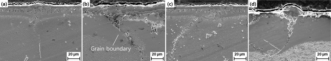 그림 6은 결정립 크기별 980°C에서 고온 산화 실험을 한 시편의 단면을 보여준다. 980°C에서는 초기 산화시(16h)에도 4 μm 이상의 외부 산화층이
