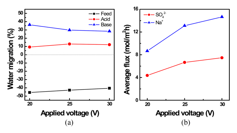 이러한 공정 중의 각 용액의 부피 변화는 회수되는 산(H2SO4)과 염기(NaOH)의 농도에 영향을 미칠 수 있는 인자로 물 이동을 최소화하거나 억제 할 수 있는 공정 조건이 필요하다고 할 수 있다. 그림 4-(b)에는 Na+ 이온과 SO42-이온의 평균 flux(mol/m2h)를 나타내었다. 인가전압의 증가에 따라 Na+와 SO42-의 flux는 증가하는 경향을 보였고, 특히 20 V에서 25 V로 인가전압이 상승할 때 Na+의 flux는 8.7에서 13.1로 SO4 2-의 flux는 4.4에서 6.7로 큰 폭으로 상승하였으나 30 V에서는 Na+의 경우는 7.5, SO42-의 경우는 14.7로 상승 폭은 다소 감소하였다.