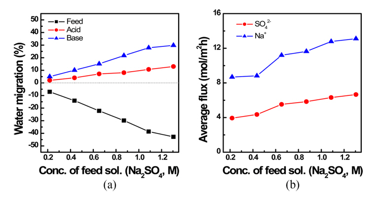 원료 용액의 농도 변화 효과를 고찰하기 위하여 용액의 농도를 0.22 M~1.30 M Na2SO4로 조절하여 실험을 실시하였다. 25 V 정전압 조건에서 원료 용액 1.5 L와 산 회수실에는 0.1 M H2SO4 용액 1.5 L를 염기 회수실에는 0.1 M NaOH 용액 1.5 L를 사용하였다. 이에 대한 결과를 그림 5에 나타내었다. 그림 5-(a)에서는 원료용액의 Na2SO4 농도가 증가함에 따라 물 이동률이 증가하였으며, Na+ 이온 농도 증가에 선형적으로 비례하여 산, 염기 용액으로의 물 이동률도 증가하였으나 원료 용액의 부피는 감소하였다. 용액들의 물 이동률은 다른 문헌들에