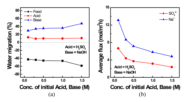M Na2SO4 원료용액 1.5 L와 초기에 장입되는 H2SO4와 NaOH 농도를 각각 0.1~1.5 M로 조절한 후 1.5 L 씩 용액으로 사용하여 실험을 실시하였다. 이에 대한 실험결과를 그림 6에 나타내었다. 그림 6-(a)는 물 이동률에 대한 결과로 0.3~1.0 M H2SO4와 NaOH을 사용한 경우 비교적 물 이동률이 큰 변화가 없었고, 1.5 M H2SO4와 NaOH을 사용하였을 경우 원료 용액실과 염기 회수실의 부피변화가 크게 증가하였다. 그림 6-(b)는 이온의 flux를 나타낸 그림으로 초기 장입되는 산 및 염기의 농도가 높아짐에 따라 Na+ 이온과 SO42- 이온의 평균 flux는 급격히 감소하여 0.1 M 농도의 flux보다 1.5 M 농도의 flux는 35% 수준으로 큰 차이를 보였다. 초기 원료