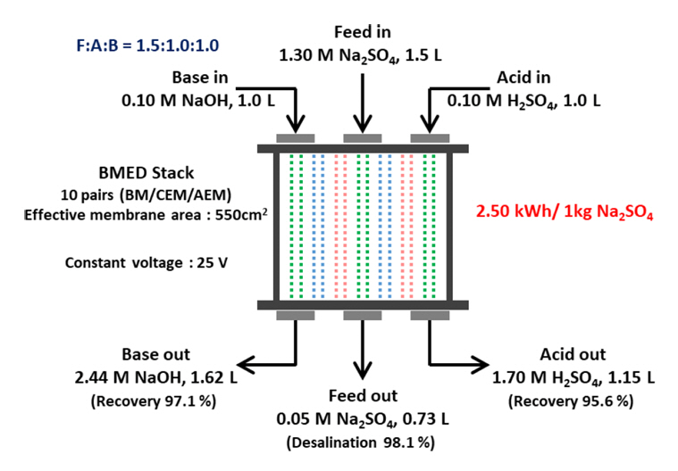 낮은 전압 조건에서 물을 분해할 수 있다. 전극으로부터 물의 분해가 아닌 바이폴라막 내부에서 물 분해를 통해 수소이온(H+)과 수산화이온(OH-)을 공급하는 역할을 한다. 바이폴라 전기투석 시스템에 의해 황산나트륨 용액을 처리하는 원리를 그림 1에 나타내었다. 원료(Feed) 용액으로 공급된 황산나트륨 용액중의 Na+와 SO42-이온은 각각 양/음이온교환막을 통과하여 분리된다. 동시에 바이폴라 막으로부터 물 분해 반응에 의해 생성된 수소이온과 수산화이온이 Na+와 SO42-이온을 만나 수산화나트륨(NaOH), 황산(H2SO4)이 생성되게 된다. 이렇게 회수된 수산화나트륨 및 황산은 순도가 높아 별도의 정제 없이 공정 중에 재사용 될 수 있고 또한 원료용액(폐수)중의 망초(Na2SO4) 성분은 탈염(Desalination)이 되기 때문에 공정수로 재사용이 가능하다는 장점이 있다.