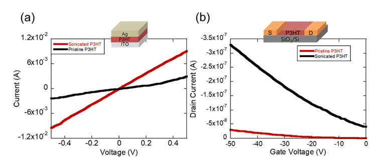 depicted in Figures 4(a) and 4(b). The significantly higher diode current observed in the sonicated P3HT, leading to