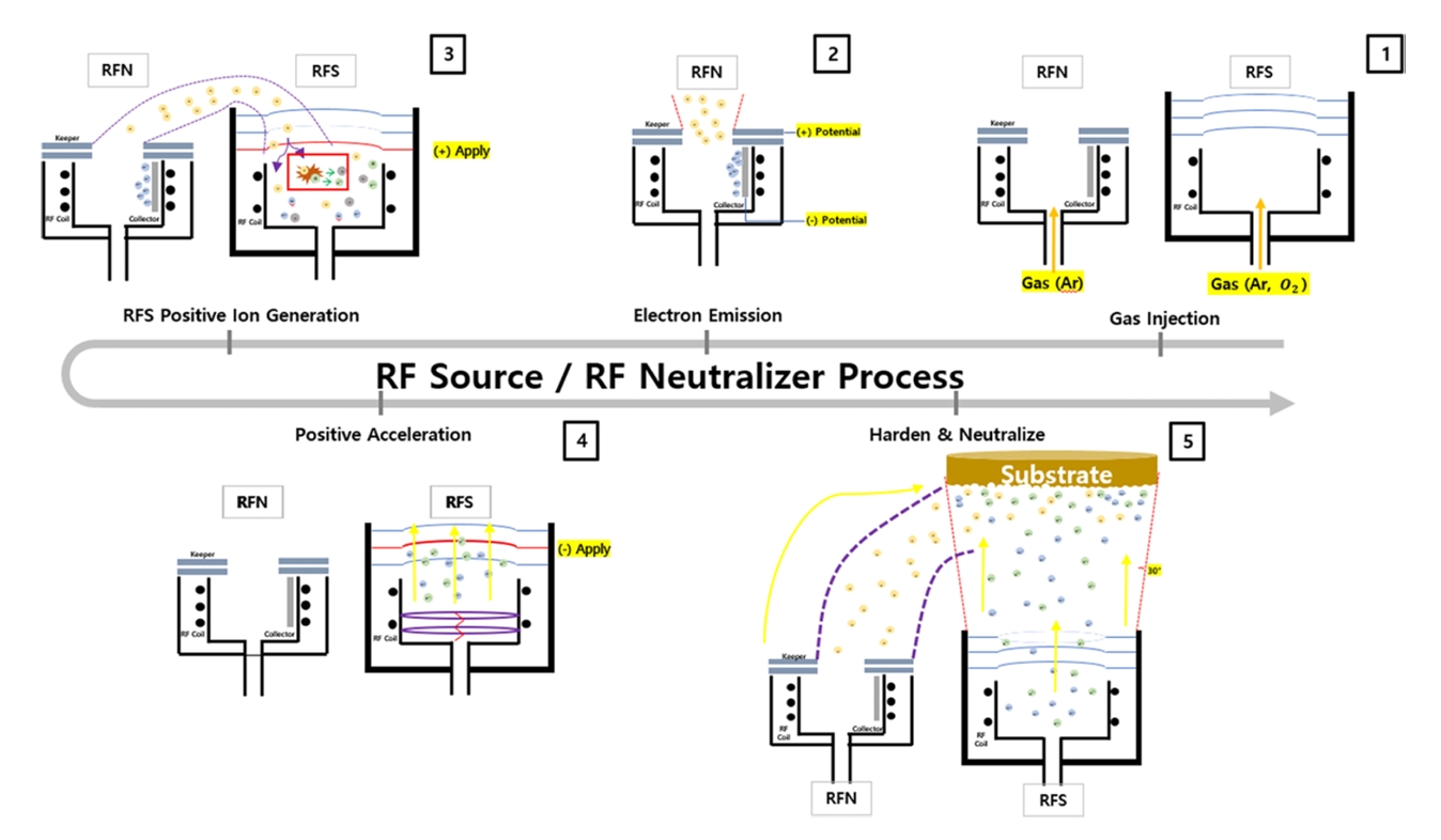 bias가 인가된 RFS의 screen grid를 통해 RFS 챔버 내부로 들어와 주입된 gas와 충돌하며, 이때 생성된 양이온(Ar+, O2+)과 전자는 RFS의 초기 동작(ignition)을 보조하고 기판에 쌓인 양이온을 중성화시킨다. 이후 플라즈마는 RFS의 RF coil을 통해 RFN의