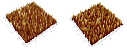 IBAD 시스템을 활용하여 증착한 Y2O3 코팅의 내플라즈마 특성을 최적화하기 위해 표 1의 16가지 조건에 따라 시편을 제작하고 동일한 조건에서 Ar/CF4 플라즈마 처리하여 분석을 진행하였다. 표 3은 제작된 시편 중 1차와 13차 시편의 표면을 AFM을 통해 분석한 결과이다. 표면의 평균 roughness 값은 1차 시편에서 9 nm로 가장