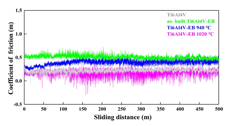 °C에서 열처리한 Ti6Al4V-EB의 마찰계수는 각 0.215, 0.509, 0.392, 0.164 μ 로 as-built Ti6Al4V-EB의