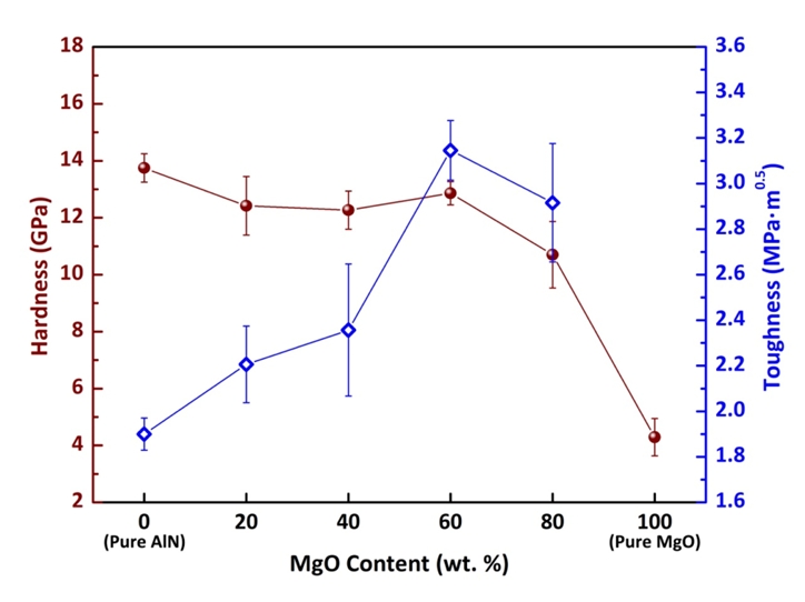 The pure AlN sample also exhibited a low fracture toughness of approximately 1.9 MPa·m0.5. With increasing MgO content, the toughness of the AlN-MgO composites first increased,