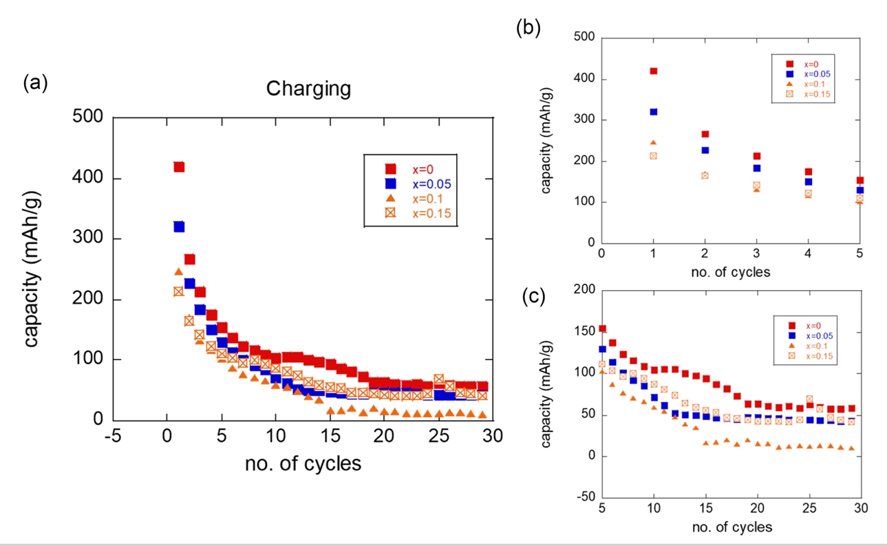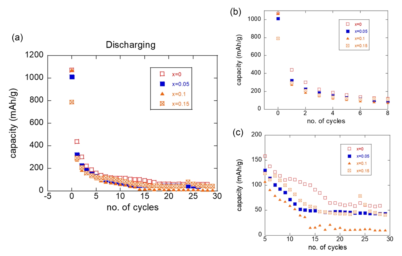 cycles, the capacity became independent of the Mg composition, as shown in Fig 6(b) and 6(c). This trend was more significant with charging cycles, as shown in Fig 7.
