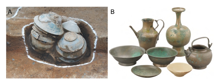 보아 인위적으로 매납한 것으로 추정하고 있다. 또한 구덩이 바닥 부분에는 주자 2점과 정병을 눕혀놓고 그 위를 감싸듯이 청동 대접과 접시를 뒤집어서