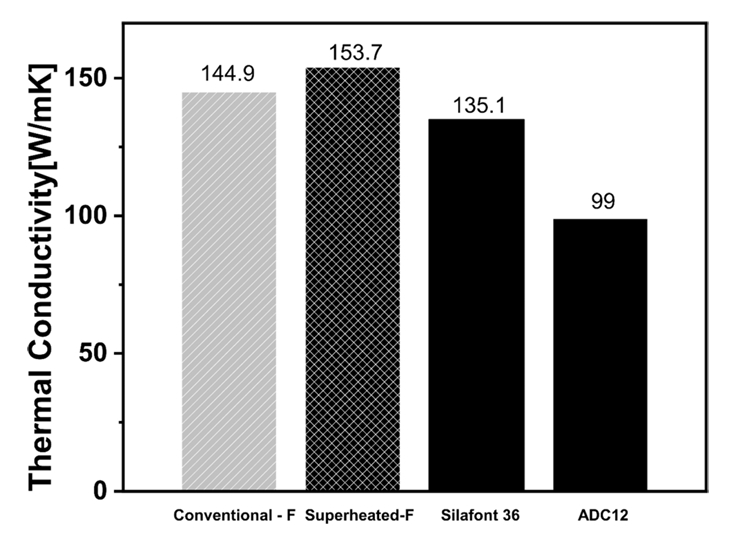Si-Si의 결합을 끊어 원소의 분산도를 높이고 그 결과로 응고에 의해 생성되는 상이 미세화 된다고 제시된 바 있다[21]. 한편 Gan 등은 0.5wt% 미만의 함량 내에서 Fe 원소의 첨가는 Si의 함량에 따라 열전도도를 증가시킬 수 있다고 보고하였다[22]. 상기 결과들을 바탕으로 과열 처리와 적절한 Fe 원소 첨가를 함께 적용할 경우 Al-Si 합금의 상반 특성을 동시에 향상시킬 수 있다는 가능성이