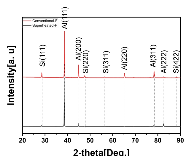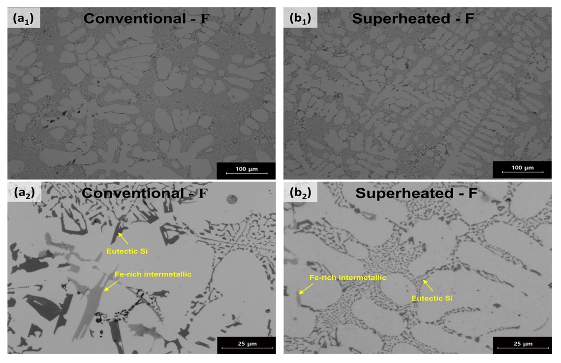 관찰한 그림 3(a2), (b2)를 보면 과열 처리를 실시한 합금(Superheated-F)에서의 공정 Si의 크기가 Conventional-F 합금과 대비하여 더 미세하게 형성되어