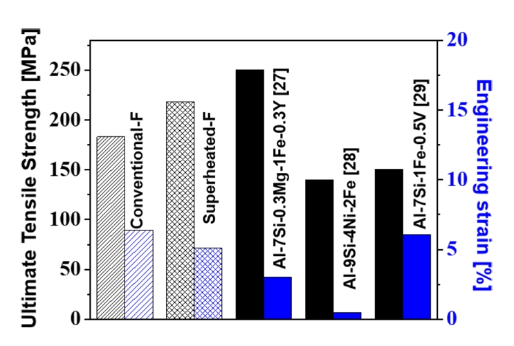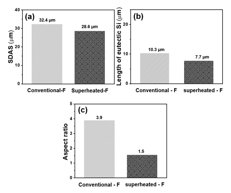 등을 비롯한 여러 보고 결과에 따르면 공정 Si이 구상화 됨에 따라 Al-Si 합금의 강도와 연신율이 동시에 향상될 수 있다고 제시되었다[23-27]. 본 연구에서 두 합금들에 대한 공정 Si의 종횡비(aspect ratio) 측정 결과(그림 4(c)), Superheated-F의 경우 1.5의 값을 나타냈고 Conventional-F의 경우 3.9로 측정되어 과열 처리를 실시한 합금의 구상화