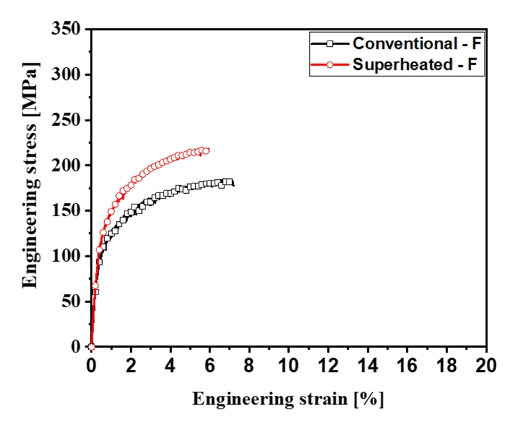 Engineering stress-strain curves of Conventional-F and Superheated-F alloys.