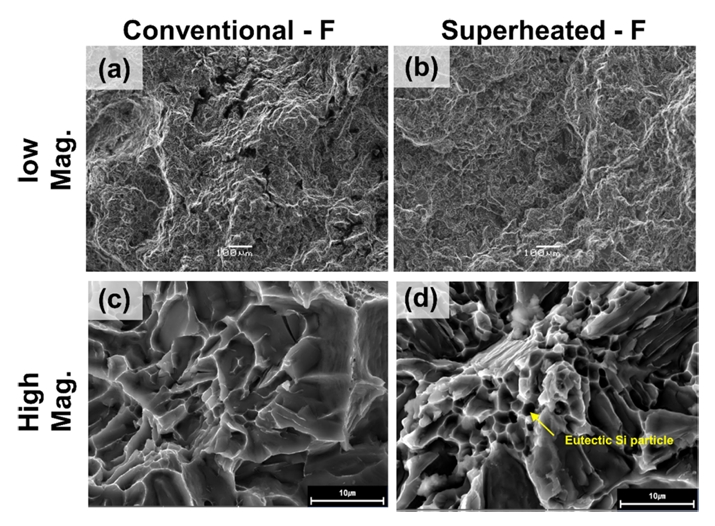 SEM images showing the fracture surfaces of (a, c) Conventional-F and (b, d) Superheated-F